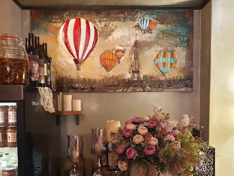 레스토랑에 들어서자마자 눈에 들어온 건 앤티크한 소품들과 은은한 조명이었다. 화려한 샹들리에가 천장에서 반짝이며 따뜻한 분위기를 더했다. 벽 한쪽에는 열기구 그림이 그려진 커다란 액자가 걸려 있었는데, 마치 프랑스의 어느 작은 레스토랑에 와 있는 듯한 착각을 불러일으켰다. 잔잔한 음악소리, 테이블마다 놓인 아름다운 꽃 장식까지, 모든 요소가 완벽하게 어우러져 낭만적인 분위기를 자아냈다. 마치 특별한 날을 위해 섬세하게 준비된 공간처럼 느껴졌다.