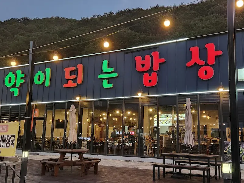 굽이굽이 산길을 따라 차를 몰아 도착한 ‘약이되는밥상’은 팔봉산유원지에서 멀지 않은 곳에 자리 잡고 있었다. 주변은 온통 푸른 나무들로 둘러싸여 있어 공기부터가 남달랐다. 식당 건물은 겉에서 보기에도 깔끔하고 정갈한 느낌이었다. 커다란 간판에 초록색과 빨간색 글씨로 쓰인 “약이되는밥상”이라는 글자가 눈에 띄었다. 밤에는 은은한 조명이 켜져 더욱 운치 있을 것 같았다.