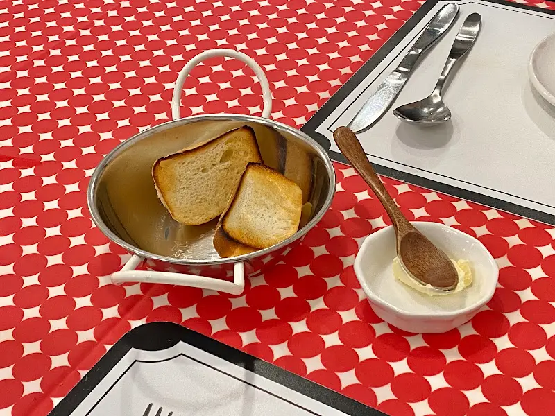 주문을 마치니 식전 빵이 나왔다. 토스트 된 빵 두 조각이 작은 양념통 모양의 그릇에 담겨 나왔고, 버터가 함께 제공되었다. 빵은 겉은 바삭하고 속은 촉촉했으며, 버터를 발라 먹으니 고소한 풍미가 입안 가득 퍼졌다. 식사를 시작하기 전 가볍게 입맛을 돋우기에 충분했다.