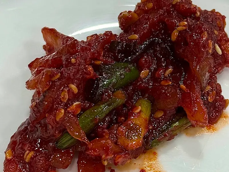특히 눈길을 끌었던 것은 오징어 젓갈이었다. 잘게 썰린 오징어와 매콤한 양념이 어우러져 보기만 해도 입맛이 다셔졌다. 젓가락으로 한 점 집어 맛보니, 짭짤하면서도 매콤한 맛이 일품이었다. 밥 위에 올려 먹으니 정말 꿀맛이었다.