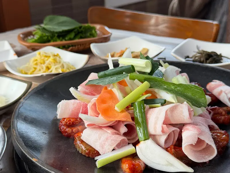 철판이 뜨겁게 달궈지자, 쭈꾸미와 삼겹살이 지글거리는 소리가 경쾌하게 울려 퍼졌다. 매콤한 향기가 코를 간지럽혔고, 나도 모르게 군침이 삼켜졌다. 사장님께서 직접 쭈꾸미를 구워주시면서 맛있게 먹는 방법을 설명해주셨다. 깻잎에 쭈꾸미와 삼겹살, 콩나물을 함께 싸서 먹으면 환상적인 맛을 느낄 수 있다고.