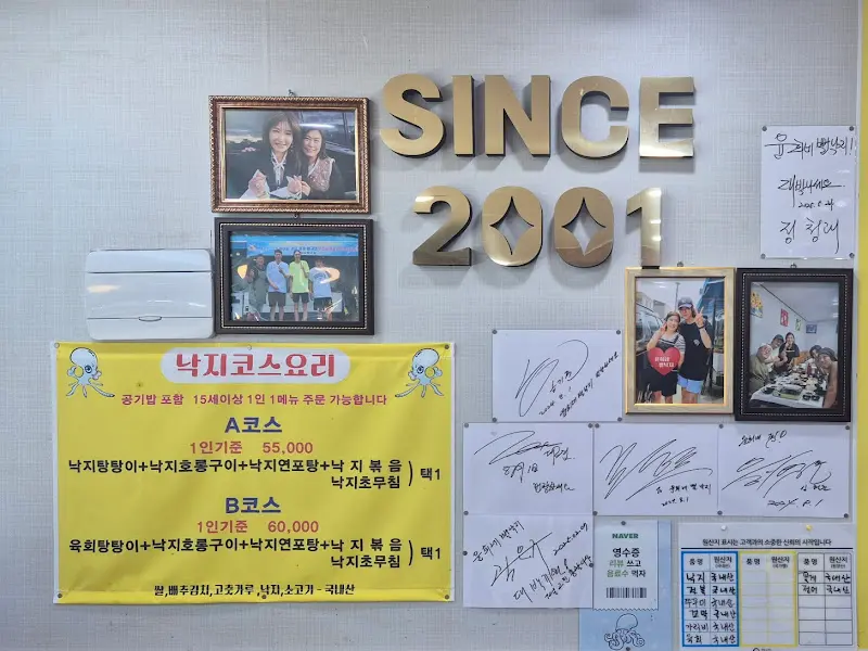 윤희네뻘낙지의 벽면에 붙어있는 'SINCE 2001' 문구와 손님들의 싸인