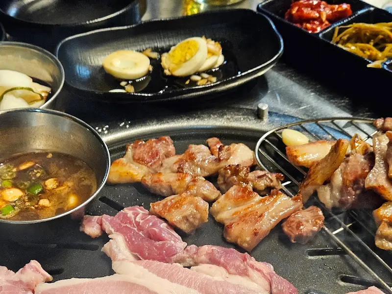 잠시 후, 숯불이 들어오고 밑반찬이 하나둘씩 테이블 위에 놓였다. 콩나물무침, 김치, 쌈 채소 등 소박하지만 정갈한 반찬들이었다. 특히 눈길을 끈 것은 삶은 계란을 잘라 마요네즈와 견과류를 곁들인 샐러드였다. 달콤하면서도 고소한 맛이 입맛을 돋우기에 충분했다.