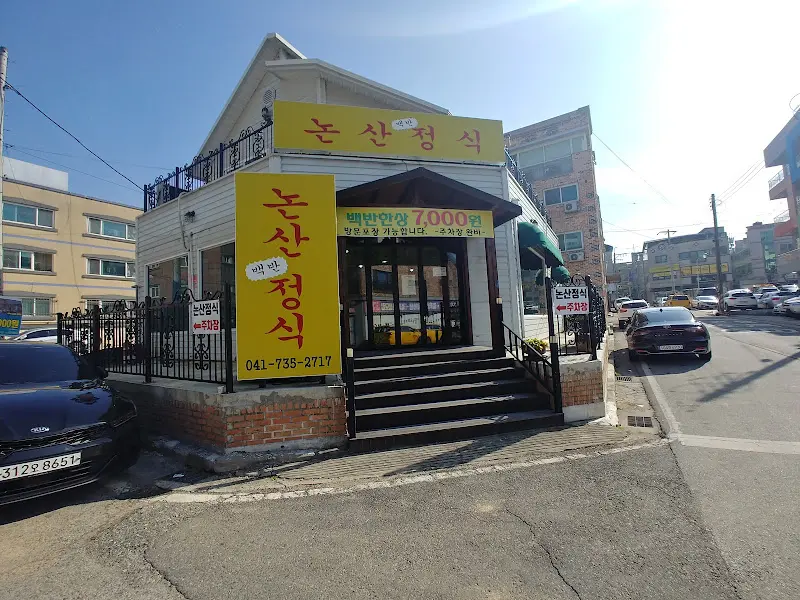 * (논산정식 식당 외부 전경): 깔끔한 외관이 인상적이다. ‘논산정식’이라는 간판과 함께 ‘백반정식 7,000원’이라는 문구가 눈에 띈다.