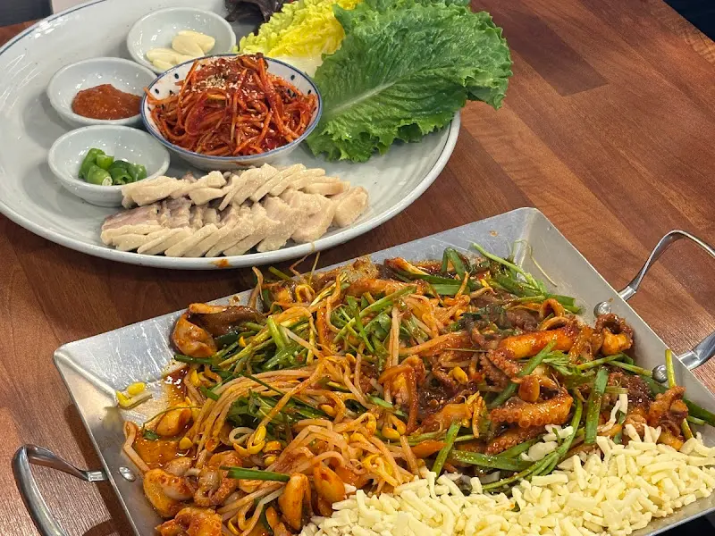 메뉴판을 펼쳐 들고 고민에 빠졌다. 보쌈도 맛있어 보이고, 파전도 땡기고… 하지만 우리의 목적은 쭈꾸미볶음이었기에, 철판 쭈꾸미볶음 세트를 주문하기로 결정했다. 쭈꾸미볶음의 맵기 조절이 가능하다는 점도 좋았다. 매운 음식을 잘 못 먹는 친구를 위해 순한 맛으로 주문하고, 치즈 사리를 추가하는 센스! 잠시 후, 테이블 위로 푸짐한 한 상이 차려졌다.