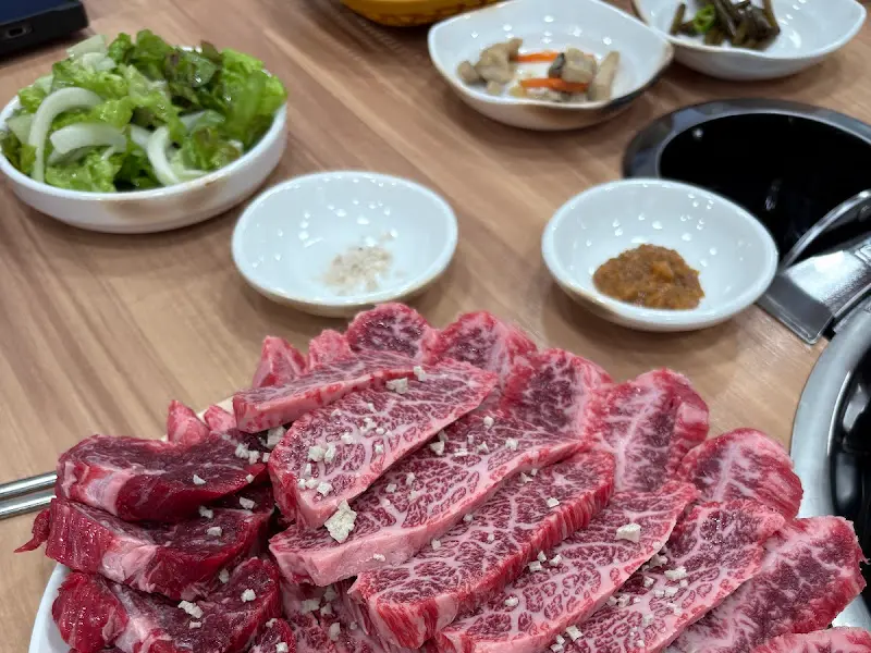 접시 위에 놓인 고기는 그야말로 예술이었다. 붉은 살코기 사이사이에 섬세하게 박힌 마블링은 마치 겨울날 나뭇가지에 핀 눈꽃 같았다. 윤기가 흐르는 표면은 신선함을 그대로 드러내는 듯했다. 어느 부위인지는 정확히 알 수 없었지만, 최고의 품질이라는 것을 한눈에 알아볼 수 있었다. 곁들여 나온 밑반찬들도 정갈했다. 신선한 채소 샐러드, 버섯볶음, 그리고 쌈무까지, 고기와 함께 먹기에 완벽한 조합이었다.