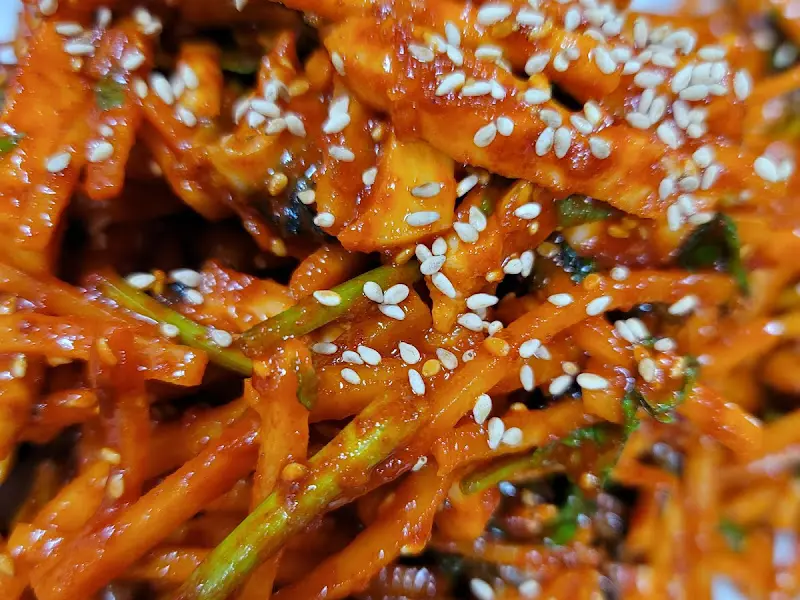 젓가락으로 오징어 한 점을 집어 입에 넣으니, 향긋한 미나리의 향과 함께 쫄깃한 오징어의 식감이 느껴졌다. 일반적인 회무침과는 확연히 다른, 오징어 자체의 풍미를 살린 맛이었다. 매콤하면서도 새콤달콤한 양념은 입맛을 돋우기에 충분했다. 특히, 톡톡 터지는 깨의 고소함이 매운맛을 중화시켜주는 듯했다.