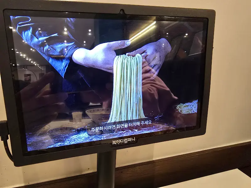 가게 문을 열고 들어서자, 왁자지껄한 활기 대신 차분하고 정돈된 분위기가 느껴졌다. 테이블 간 간격도 넉넉해서 편안하게 식사를 즐길 수 있겠다는 생각이 들었다. 벽 한쪽에는 면을 만드는 과정을 담은 영상이 상영되고 있었는데, 장인의 손길이 느껴지는 모습에 기대감이 더욱 커졌다.