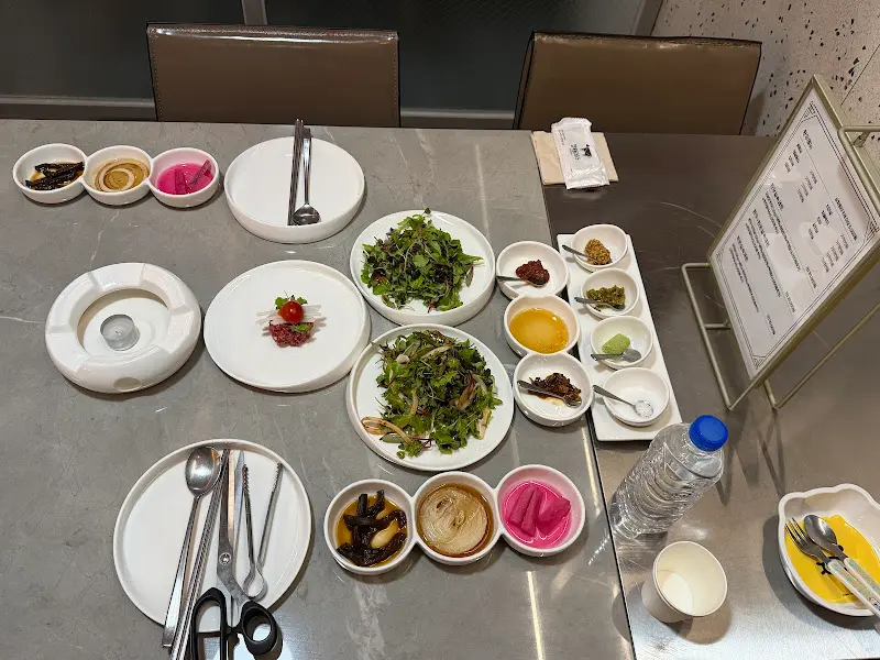 주문 후 얼마 지나지 않아, 다양한 밑반찬들이 테이블 위를 가득 채웠다. 신선한 샐러드부터 시작해서, 고기와 곁들여 먹기 좋은 장아찌, 쌈무, 갓김치까지, 하나하나 정성이 느껴지는 맛깔스러운 반찬들이었다. 특히 눈길을 끈 것은 앙증맞은 크기의 볼에 담겨 나온 다채로운 소스들이었다. 쌈장, 소금, 와사비, 그리고 특제 소스까지, 취향에 따라 고기를 다양한 맛으로 즐길 수 있도록 배려한 점이 인상적이었다.