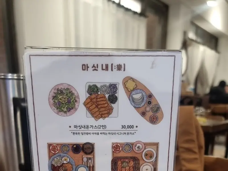 자리에 앉아 메뉴판을 펼쳐 들었다. 10,000원 초반대의 다양한 돈까스 메뉴들이 눈에 들어왔다. 가장 먼저 눈에 띈 것은 이곳의 대표 메뉴인 ‘마싯내 돈가스(2인)’. 쫀득한 밀전병에 야채를 싸 먹는다는 설명에 호기심이 발동했다. 등심 돈까스와 치즈 돈까스, 매콤 철판 돈까스 등 다른 메뉴들도 궁금했지만, 처음 방문한 만큼 대표 메뉴를 맛보기로 결정했다.