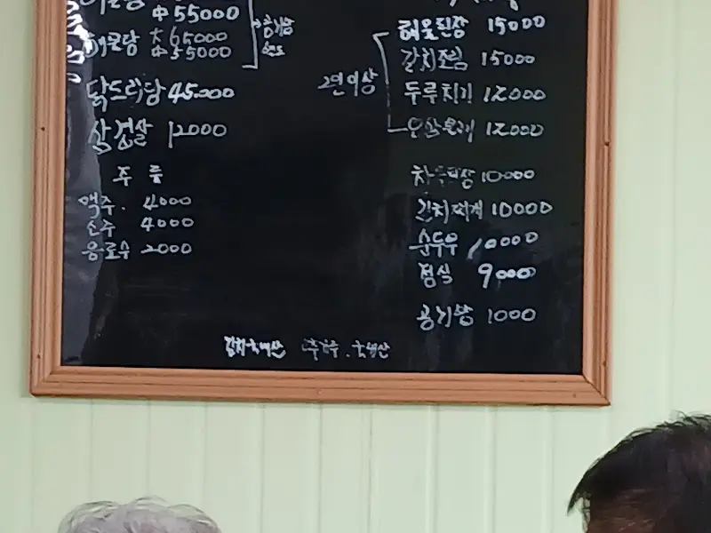 식당 앞에 차를 세우고 안으로 들어서니, 정겨운 함바집 같은 분위기가 물씬 풍겼다. 테이블 몇 개가 놓인 아담한 공간에는 이미 동네 주민들로 북적거리고 있었다. 역시, 이런 곳이야말로 진짜 맛집이라는 직감이 왔다. 메뉴판은 칠판에 분필로 삐뚤빼뚤 적혀 있었는데, 오히려 그 모습이 정겹게 느껴졌다. 두루치기, 해물된장, 백반 등 소박한 메뉴들이 눈에 띄었다.