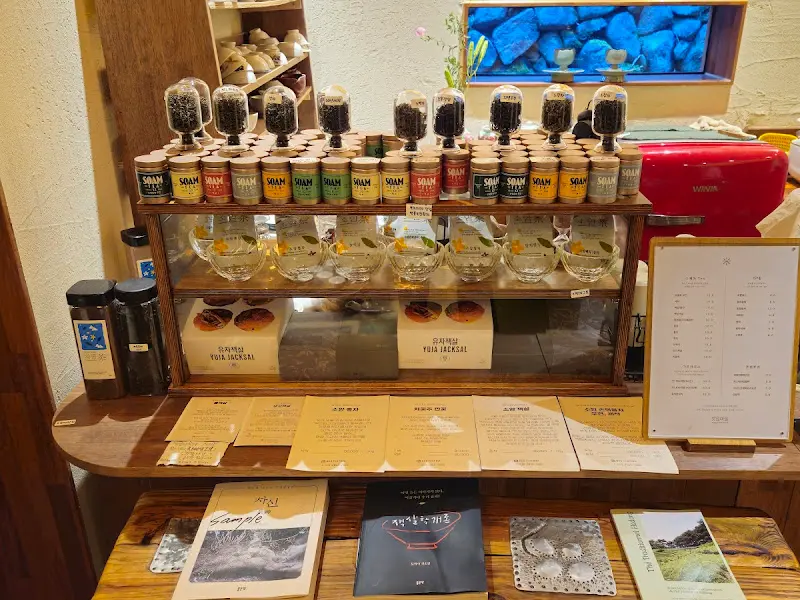 문을 열고 들어서자 은은한 차향이 코끝을 간지럽혔다. 테이블과 의자는 나무의 질감을 그대로 살려 편안함을 더했고, 벽면에는 찻잎과 관련된 다양한 제품들이 진열되어 있었다. 마치 작은 갤러리에 들어선 듯한 느낌이었다. 차분한 조명 아래, 가지런히 놓인 다구들이 정갈한 분위기를 자아냈다.