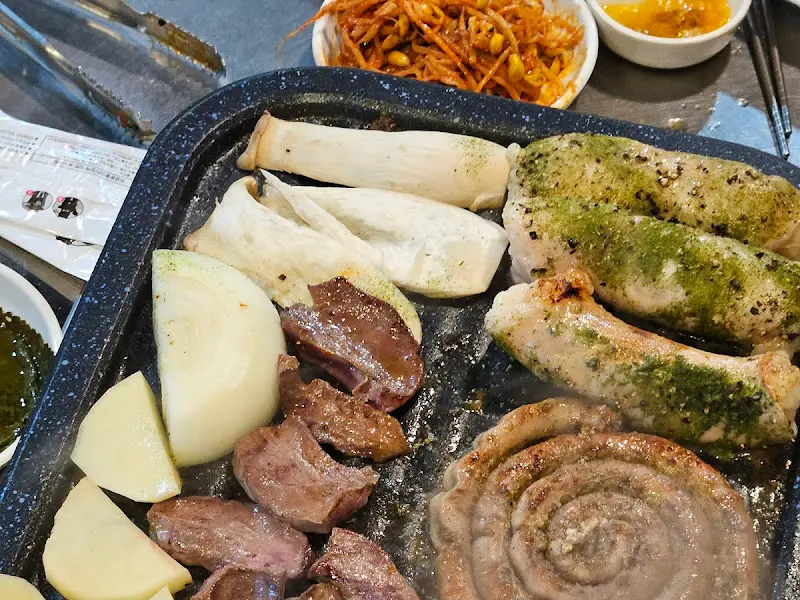 드디어 기다리고 기다리던 막창이 등장했다. 불판 위에서 지글거리는 소리와 함께, 코를 찌르는 고소한 냄새가 식욕을 자극했다. 윤기가 자르르 흐르는 막창의 자태는, 사진으로 담아내지 않고는 못 배길 정도였다. 사진 속 막창은 겉은 노릇하게 익어가고, 속은 촉촉함을 머금은 듯했다. 함께 올라간 양파와 버섯, 그리고 꼼장어는 풍성한 비주얼을 완성하며, 맛에 대한 기대감을 더욱 고조시켰다.