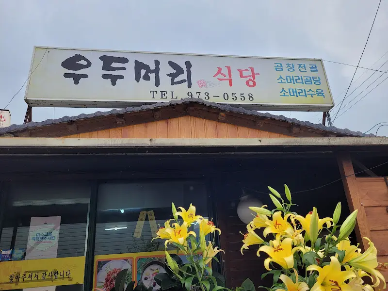 꼬불꼬불한 시골길을 따라 한참을 달리니, 드디어 ‘우두머리식당’ 간판이 눈에 들어왔다. 주변은 온통 푸른 논밭으로 둘러싸여 있어, 마치 시간이 멈춘 듯 고요하고 평화로운 분위기였다. 식당 앞에는 노란 코스모스가 하늘거리고, 낡은 기와지붕이 정겹게 느껴졌다. 간판 옆에는 곱창전골, 소머리곰탕 등의 메뉴가 적혀 있었다. 오늘 나의 선택은 이미 정해져 있었다. 얼큰하고 푸짐한 곱창전골!