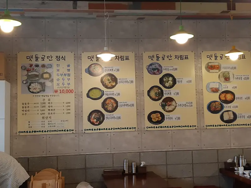 도착한 맷돌로만은 겉에서부터 정갈한 느낌을 풍겼다. 건물 외벽에는 “두부요리 전문점”이라는 문구가 크게 적혀 있었고, 국산콩 100%라는 문구가 신뢰감을 더했다. 커다란 맷돌 그림이 그려진 간판은 이곳이 전통적인 방식으로 두부를 만드는 곳임을 짐작하게 했다. 식당 안으로 들어서자, 은은한 콩 삶는 냄새가 코를 간지럽혔다.