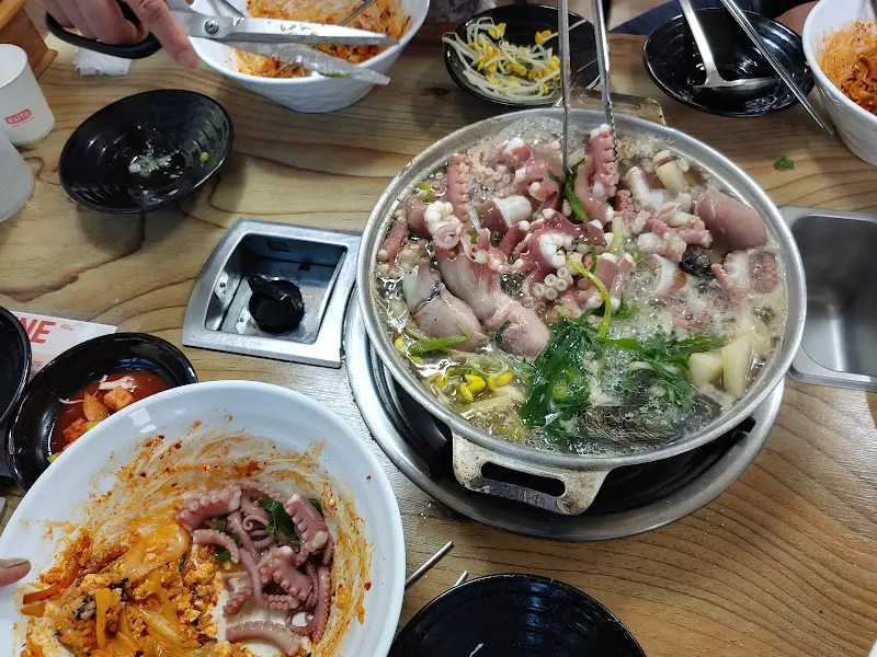 자리에 앉자마자 점심 특선 세트를 주문했다. 11,000원이라는 착한 가격에 낙지볶음, 얇은 치즈피자, 막국수까지 맛볼 수 있다니, 이 어찌 혜자롭지 아니한가! 메뉴를 기다리는 동안, 가게 안을 둘러보았다. 테이블마다 놓인 스테인리스 냄비에는 뽀얀 국물에 담긴 낙지들이 춤을 추듯 꿈틀거리고 있었다 . 싱싱한 낙지를 보니 더욱 기대감이 커졌다.