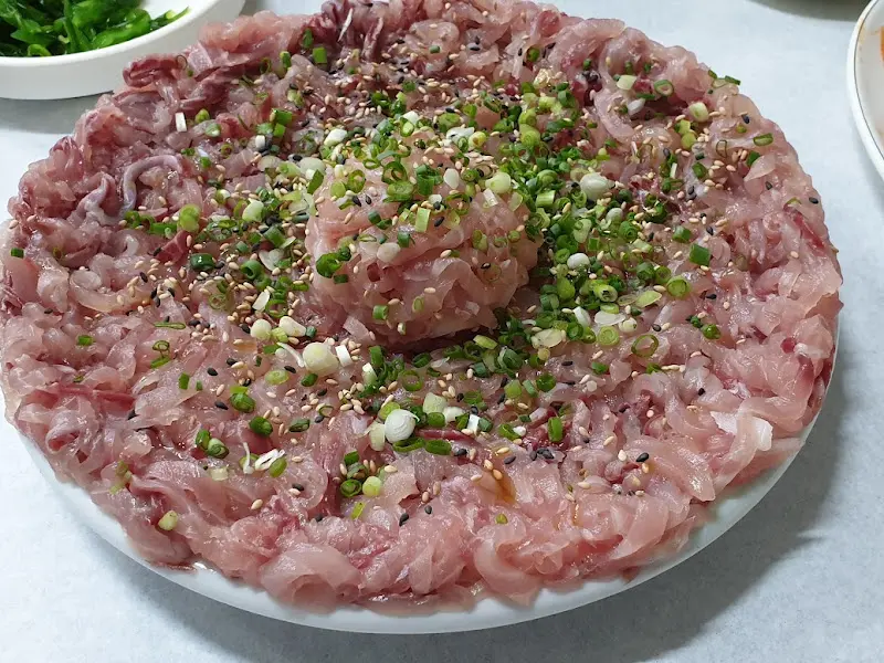 드디어 기다리고 기다리던 향어회가 등장했다. 얇게 포를 뜬 향어회는 윤기가 좌르르 흐르는 것이 보기만 해도 군침이 돌았다. 가운데에는 잘게 다진 향어회가 마치 꽃처럼 뭉쳐져 있었고, 그 위에는 тонко нарезанный зеленый лук и кунжут были разбросаны. 마치 예술 작품을 보는 듯한 아름다운 모습에 감탄사가 절로 나왔다.