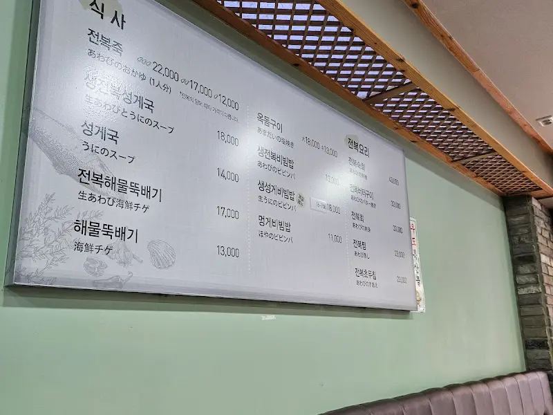 식당 안으로 들어서자, 따뜻한 보리차 향이 은은하게 퍼져 나왔다. 테이블에 놓인 수저통은 깨끗하게 관리되어 있었고, 직원들은 분주하게 움직이며 손님을 맞이하고 있었다. 메뉴판을 보니 전복죽, 성게미역국, 해물뚝배기, 옥돔구이 등 제주 향토 음식들이 가득했다. 잠시 고민하다 전복해물뚝배기와 옥돔구이를 주문했다.