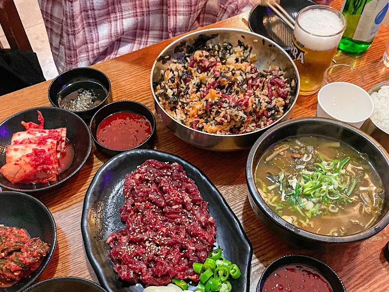 함께 주문한 김치육회비빔밥도 기대 이상이었습니다. 김치, 김가루, 깻잎, 그리고 육회가 푸짐하게 들어간 비빔밥은, 보기만 해도 군침이 돌았습니다. 젓가락으로 쓱쓱 비벼 한 입 맛보니, 매콤하면서도 고소한 맛이 입안 가득 퍼졌습니다. 특히 김치의 아삭한 식감과 육회의 부드러움이 환상적인 조화를 이루었습니다. 테이블에 놓인 고추장을 조금 넣어 비벼 먹으니, 더욱 깊은 맛을 느낄 수 있었습니다.
