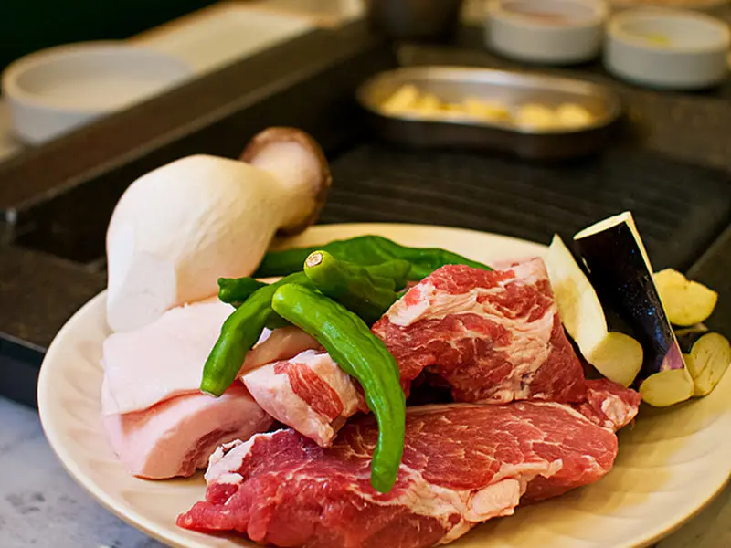자리에 앉자 직원분께서 친절하게 메뉴를 설명해 주셨다. 우리는 고민 끝에 이곳의 대표 메뉴인 ‘고기 3종 세트’를 주문했다. 잠시 후, 숯불이 들어오고 밑반찬들이 테이블 위에 차려지기 시작했다. 밑반찬들의 종류가 정말 다양했는데, 마치 고기 샐러드를 먹는 듯한 느낌을 받을 정도로 신선한 야채들이 푸짐하게 제공되었다. 구운 꽈리고추와 가지, 숙주나물 등 다채로운 곁들임 메뉴들은 고기와 함께 먹기에 더할 나위 없이 완벽한 조합이었다. 특히, 신선한 야채를 마음껏 가져다 먹을 수 있도록 셀프바가 마련되어 있다는 점이 마음에 쏙 들었다. 고기와 야채를 함께 즐기는 것을 좋아하는 나에게는 최고의 장소였다.