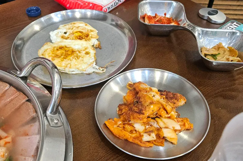 셀프 코너에서 가져온 계란후라이와 김치전도 부대찌개와 환상의 궁합을 자랑했다. 특히, 따뜻한 계란 노른자를 톡 터뜨려 밥에 비벼 먹으니 고소함이 두 배가 되었다. 김치전은 매콤하면서도 짭짤한 맛으로 입맛을 돋우는 역할을 톡톡히 했다.