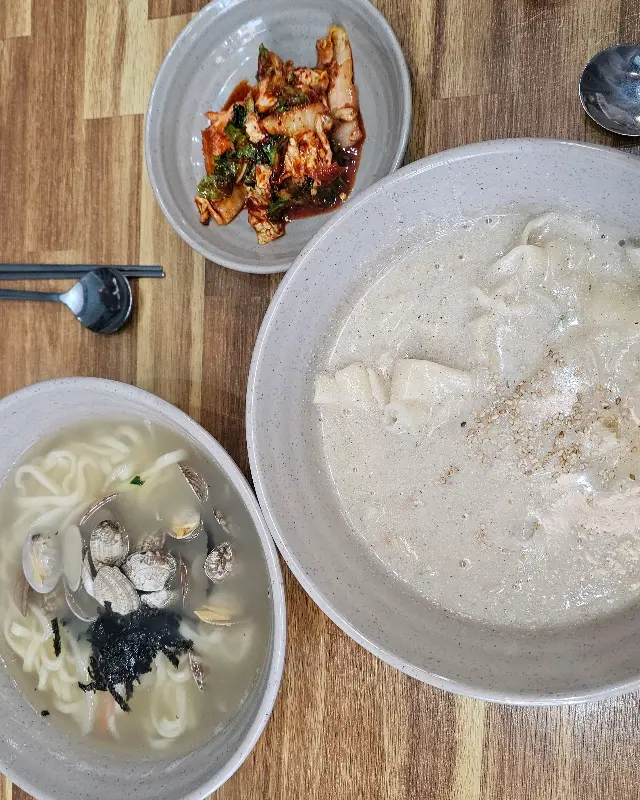 드디어 기다리고 기다리던 바지락칼국수가 테이블에 놓였다. 뽀얀 국물 위로 쫄깃한 면발과 신선한 바지락이 듬뿍 올려져 있었다. 김가루와 다진 애호박, 당근이 색감을 더해 먹음직스러운 비주얼을 완성했다. 젓가락으로 면을 휘저으니, 탱글탱글한 면발이 춤을 추듯 살아 움직였다.