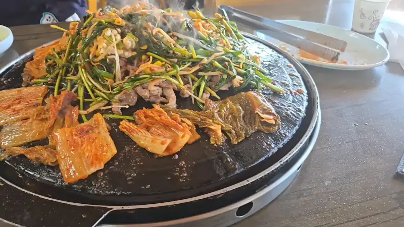 불판 위에 오리고기를 올리니, 치익- 하는 소리와 함께 고소한 냄새가 코를 자극했다. 에서 보듯이, 불판 위에서 오리고기와 부추, 콩나물, 김치가 함께 익어가는 모습은 정말 먹음직스러웠다. 군침을 삼키며, 오리고기가 익기만을 기다렸다.