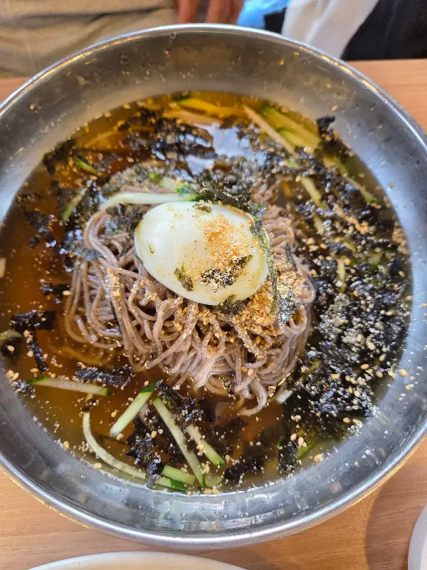 두일막국수의 물막국수는 슴슴하면서도 깔끔한 육수와 쫄깃한 면발이 조화롭게 어우러져, 더운 날씨에 지친 입맛을 되살려주는 완벽한 선택이었다. 스테인리스 그릇에 담겨 나온 막국수는 보기만 해도 시원함이 느껴졌고, 살얼음이 동동 떠 있는 육수는 청량감을 더했다. 면 위에는 김 가루와 깨소금이 넉넉하게 뿌려져 있어 고소한 풍미를 더했고, 오이채와 무 절임은 아삭한 식감을 더해 다채로운 맛을 선사했다. 특히, 삶은 계란 반쪽은 막국수의 슴슴한 맛을 부드럽게 감싸주어 완벽한 마무리를 장식했다.
