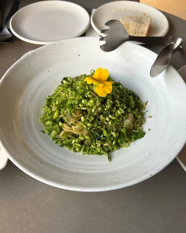 드디어 기다리고 기다리던 미나리 파스타가 나왔다. 마치 정원을 옮겨놓은 듯한 비주얼에 감탄사가 절로 나왔다. 파스타 위에 소담하게 올라간 노란 꽃잎이 싱그러움을 더했다. 젓가락으로 휘휘 저어 면과 미나리를 함께 맛보니, 입안 가득 향긋한 미나리 향이 퍼져 나갔다. 은은하게 느껴지는 단맛과 톡톡 터지는 식감 또한 훌륭했다. 양식임에도 불구하고 속이 편안한 느낌이 드는 것이 신기했다.