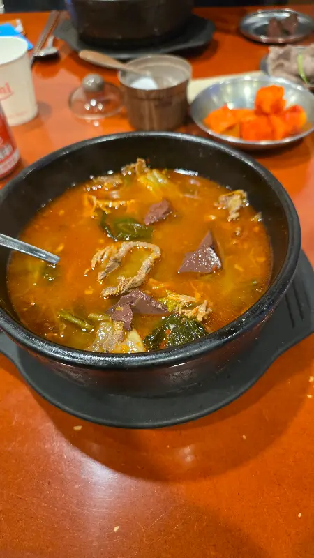 진한 갈색 국물 위로 듬뿍 올려진 소고기 양지와 선지, 우거지, 대파가 먹음직스러운 자태를 뽐냈다. 얇게 썰린 소고기는 부드럽고 고소했으며, 신선한 선지는 잡내 없이 쫀득했다. 특히, 깊고 진한 육향이 느껴지는 국물은 얼큰하면서도 시원해, 속을 씻어 내리는 듯한 개운함을 선사했다. 과음으로 지친 속을 달래주는 따뜻함이 온몸으로 퍼져나갔다.