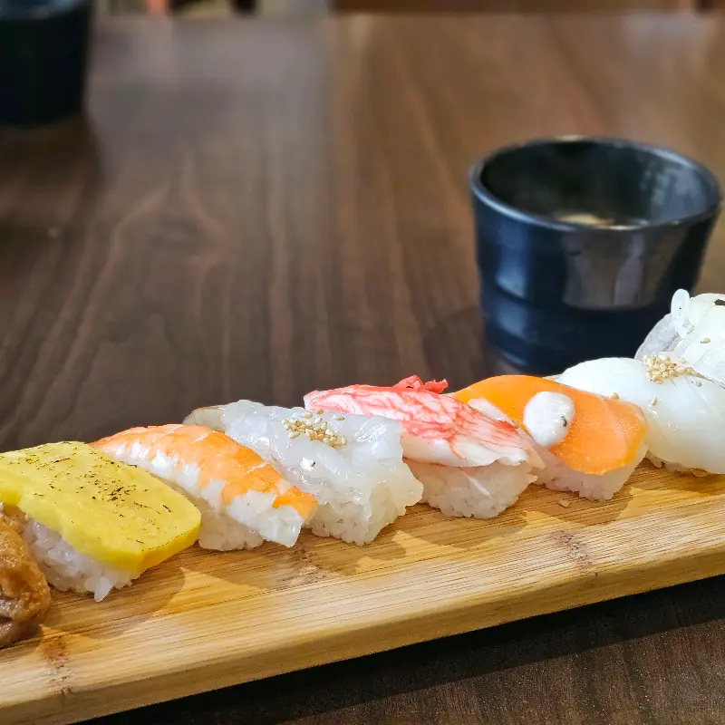 드디어 기다리고 기다리던 ‘정성 특선 초밥’이 눈앞에 모습을 드러냈다. 나무로 된 기다란 접시 위에 형형색색의 초밥들이 정갈하게 놓여 있었다. 마치 예술 작품을 감상하는 듯한 기분이었다. 윤기가 흐르는 신선한 횟감과 밥알의 조화는 시각적으로도 완벽했다. 을 보면, 가지런히 놓인 초밥들이 마치 보석처럼 빛나고 있다. 계란 초밥의 노란 빛깔, 새우 초밥의 붉은 빛깔, 광어 초밥의 투명한 빛깔이 어우러져 아름다운 색감을 뽐냈다.