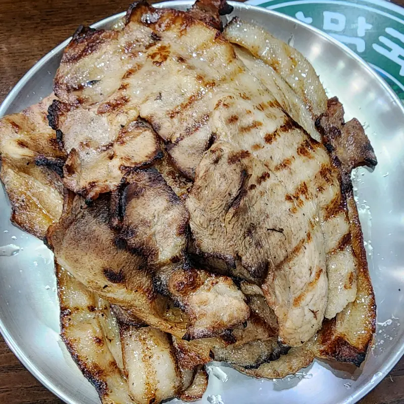 막국수를 몇 젓가락 먹으니, 숯불구이가 나왔다. 뜨겁게 달궈진 철판 위에 먹음직스럽게 구워진 숯불구이는 윤기가 자르르 흘렀다. 숯불 향이 코를 자극하며 식욕을 더욱 돋우었다. 돼지갈비 부위를 사용한 듯한 숯불구이는 기름기는 쫙 빠지고, 담백하면서도 쫄깃한 식감이 일품이었다.