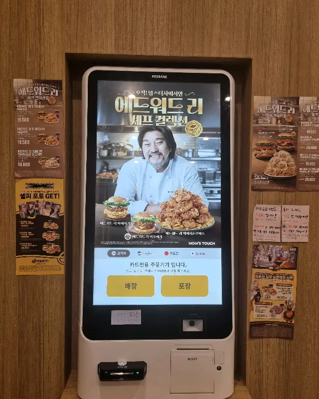 가게 문을 열고 들어서자, 깔끔하고 청결한 내부가 가장 먼저 눈에 들어왔다. 밝은 조명 아래, 테이블마다 간격을 넉넉하게 두어 편안하게 식사를 즐길 수 있도록 배려한 점이 돋보였다. 나무 소재 테이블과 의자는 따뜻하고 아늑한 분위기를 더했다. 벽면에는 맘스터치의 로고와 캐릭터를 활용한 감각적인 디자인이 눈길을 사로잡았다. 특히, 기다란 소파 좌석은 편안함을 더해주어 혼밥을 즐기기에도, 친구와 담소를 나누기에도 안성맞춤처럼 보였다.