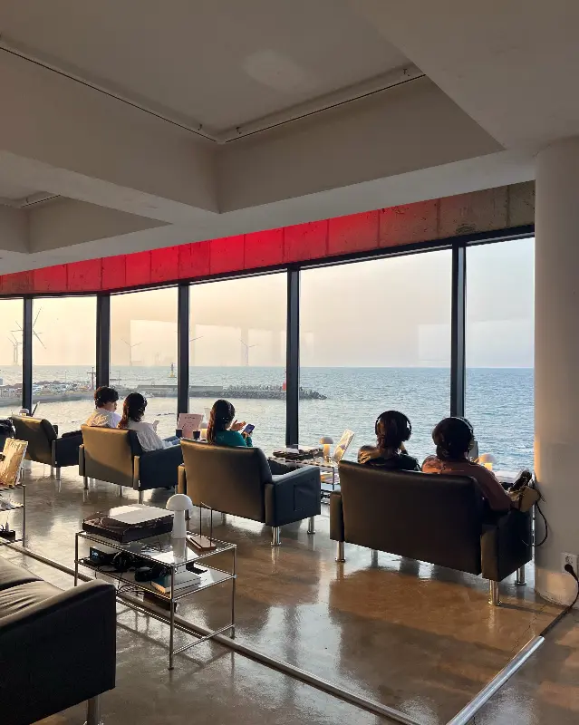 자리를 잡기 위해 카페를 둘러보았다. 2층은 국내 가요, 3층은 팝과 재즈 LP가 준비되어 있다고 했다. 3층으로 올라가니, 2층보다 더 탁 트인 전망이 눈에 들어왔다. 창가 자리에 앉으니 마치 바다 위에 떠 있는 듯한 느낌이 들었다.