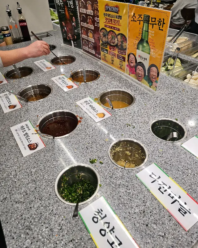 고기를 주문하기 전, 샐러드바부터 둘러봤다. 싱싱한 쌈 채소는 기본, 김치, 콩나물, 파채 등 고기와 곁들여 먹으면 맛있는 반찬들이 가득했다. 특히 눈길을 끌었던 것은 다양한 소스 코너였다. 8가지나 되는 다채로운 소스들이 준비되어 있어, 취향에 따라 고기의 풍미를 더욱 끌어올릴 수 있다.