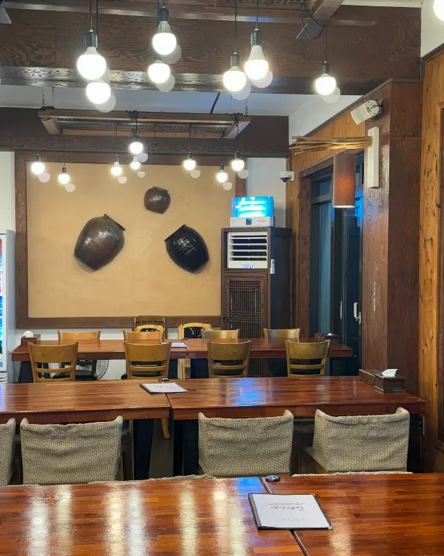 여행 당일, 렌터카를 몰아 드넓은 제주 풍경을 감상하며 ‘옛날옛적’으로 향했다. 네비게이션이 안내하는 대로 따라가니, 넓찍한 주차장을 가진 식당이 눈에 들어왔다. 주차 공간이 넉넉해서 운전 초보인 나도 마음 편히 주차할 수 있었다. 문을 열고 들어서자, 깔끔하고 넓은 홀이 펼쳐졌다. 나무 테이블과 의자가 정갈하게 놓여 있었고, 은은한 조명이 따뜻한 분위기를 더했다.