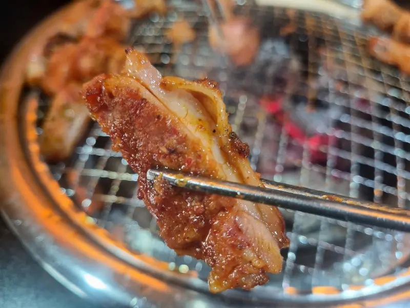 나는 닭갈비, 닭목살, 염통, 닭발을 쉴 새 없이 숯불 위에 올려 구워 먹었다. 무한리필이라 부담 없이 즐길 수 있다는 점이 가장 큰 매력이었다. 닭갈비는 간장 양념과 고추장 양념을 번갈아 가며 먹으니 질릴 틈이 없었다. 닭목살은 쫄깃한 식감을 즐기기 위해 바싹 구워 먹었고, 닭발은 매운맛을 즐기기 위해 숯불에 오래 구워 먹었다.