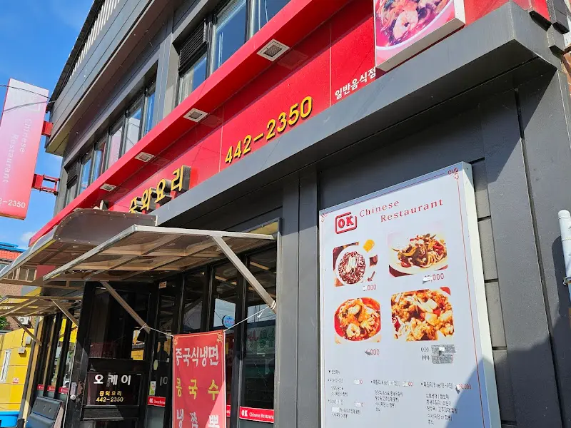 붉은색 간판이 인상적인 오케이반점의 외관. 메뉴 사진들이 붙어 있어 어떤 음식을 판매하는지 한눈에 알 수 있다.