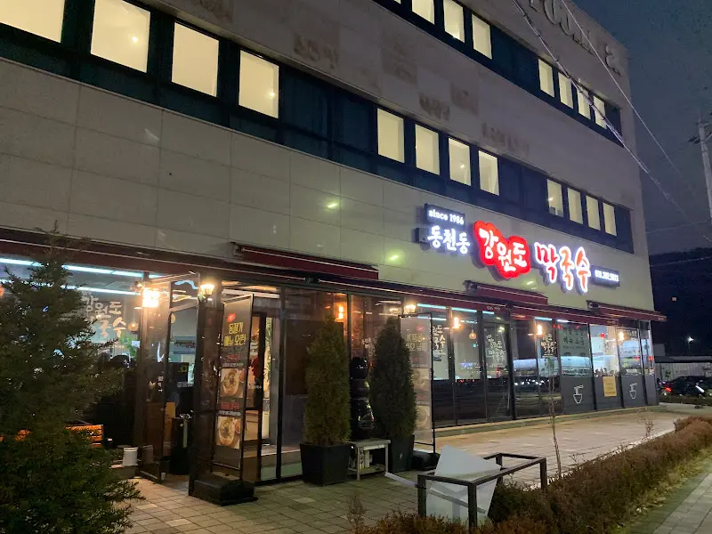 오랜만에 코끝을 간지럽히는 뭉근한 메밀 향에 이끌려, 용인 수지 동천동에 자리한 막국수 전문점을 찾았습니다. 산으로간고등어 근처로 이전했다는 소식을 듣고, 드넓은 주차장이 생겼을 거란 기대감에 부풀어 있었죠. 예전 구동천 시절에는 주차 때문에 애를 먹었던 기억이 생생했거든요. 역시나, 넉넉한 주차 공간이 확보되어 있어 마음 편히 차를 댈 수 있었습니다. 외관은 3층 높이의 건물에 자리 잡고 있으며, 붉은색 네온사인으로 빛나는 “동천동 강원도 막국수” 간판이 멀리서도 눈에 띄었습니다.