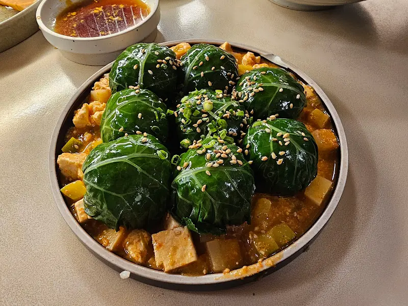 케일 쌈을 하나 집어 강된장을 살짝 올려 맛을 보았다. 슴슴하면서도 고소한 맛이 입안 가득 퍼졌다. 케일의 신선함과 강된장의 깊은 맛이 어우러져 묘한 조화를 이루었다. 다만, 쌈 자체에는 간이 거의 되어 있지 않아 짭짤한 맛을 좋아하는 사람에게는 다소 심심하게 느껴질 수도 있겠다는 생각이 들었다. 하지만 슴슴한 맛 덕분에 재료 본연의 맛을 더욱 잘 느낄 수 있었고, 먹고 나서도 속이 편안했다.