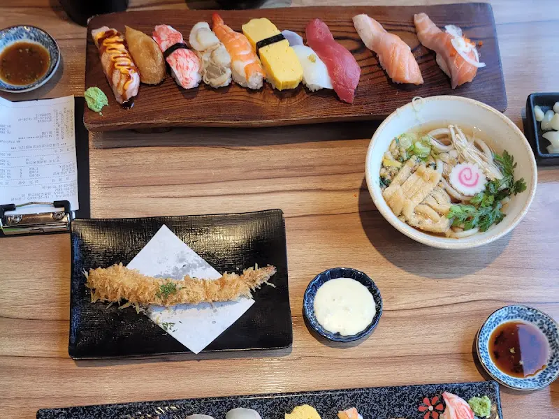 드디어 기다리고 기다리던 메인 메뉴가 등장했다. 나무 도마 위에 정갈하게 담겨 나온 초밥들은 그 화려한 비주얼에 감탄을 자아냈다. 윤기가 흐르는 신선한 횟감과 앙증맞은 밥알의 조화는 보기만 해도 군침이 돌았다. 2인 세트에는 초밥 10pcs, 사시미 2pcs, 치라시스시, 새우튀김, 그리고 우동까지 포함되어 있어 정말 푸짐했다.