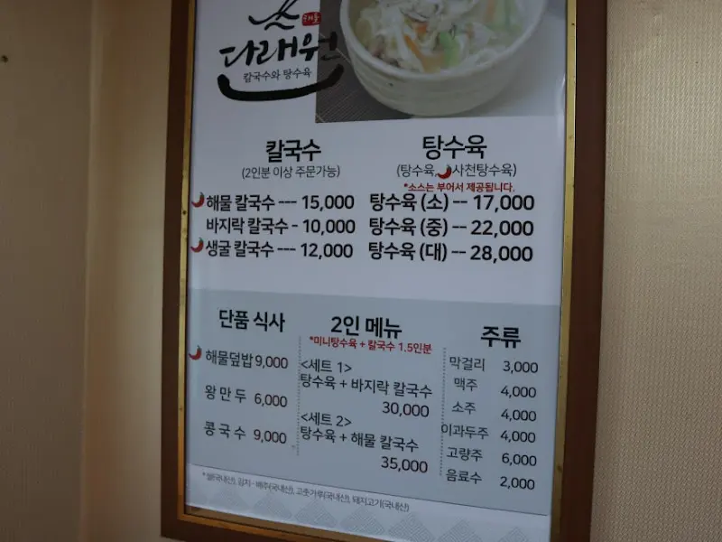 다래원에서 맛본 해물칼국수와 탕수육은 기대 이상이었다. 푸짐한 양과 저렴한 가격은 물론, 맛 또한 훌륭했다. 특히, 탕수육은 사장님의 중식 요리 실력을 엿볼 수 있는 메뉴였다. 칼국수와 탕수육이라는 이색적인 조합도 꽤나 만족스러웠다.
