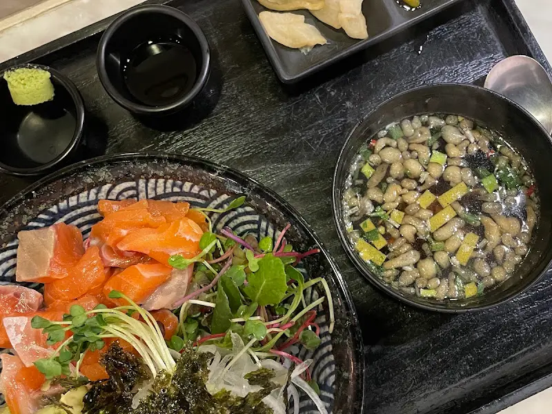 잠시 후, 드디어 기다리고 기다리던 사케동이 나왔다. 검은색 쟁반 위에 정갈하게 놓인 덮밥, 장국, 그리고 곁들임 반찬들. 뚜껑이 덮인 장국이 특히 인상적이었다. 왠지 모르게 고급스러운 느낌이랄까. 덮밥 위에는 윤기가 흐르는 연어와 신선한 채소들이 듬뿍 올려져 있었다. 보기만 해도 군침이 돌았다. 이미지들을 살펴보니, 다른 메뉴들의 플레이팅도 하나같이 정갈하고 예뻤다. 특히 믹스동은 연어와 새우를 함께 즐길 수 있어서 인기가 많은 것 같았다.