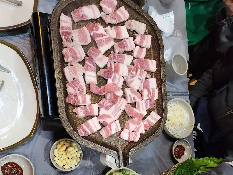 드디어 기다리고 기다리던 삼겹살이 등장했다. 큼지막하게 썰린 삼겹살은 선홍빛 육색과 촘촘한 마블링이 예술이었다. 불판 위에 삼겹살을 올리자, “치익” 소리와 함께 고소한 기름 냄새가 코를 찔렀다. 순식간에 식욕이 폭발하는 순간이었다.