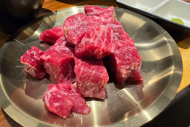 황금빛 쟁반 위에 놓인 큐브눈꽃살은 그야말로 예술 작품이었다. 깍둑썰기된 고기들은 선명한 붉은색과 섬세한 마블링이 조화를 이루며, 마치 보석처럼 빛나고 있었다. 촘촘하게 박힌 지방은 마치 눈꽃이 피어난 듯 아름다웠고, 신선함이 눈으로도 느껴졌다. 얼른 숯불 위에 올려 구워 먹고 싶은 마음이 간절했다.