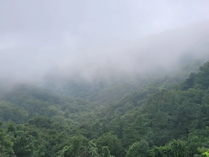 굽이진 길을 따라 오르는 동안, 점점 짙어지는 안개는 오히려 기대감을 더했습니다. 과연 어떤 풍경이 나를 기다리고 있을까. 드디어 도착한 “반지만쥬막국수”는 소박하면서도 정겨운 분위기를 풍겼습니다. 일부러 흐린 날을 택했던 건 신의 한 수였을까요. 겹겹이 쌓인 산등성이를 부드럽게 감싸 안은 안개가 몽환적인 분위기를 자아냈습니다. 마치 한 폭의 수묵화 속에 들어온 듯, 현실과 동떨어진 세상에 발을 들인 기분이었습니다.
