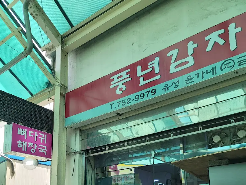 풍년 감자집은 시장 안쪽에 자리 잡고 있었다. 낡은 간판에는 세월의 흔적이 고스란히 묻어났지만, 오히려 그 모습이 오랜 역사와 전통을 자랑하는 듯했다. 붉은색 간판에 흰 글씨로 적힌 “풍년감자”라는 상호가 눈에 띄었고, 그 아래에는 전화번호와 함께 “유성 윤가네”라는 문구가 함께 적혀 있었다. 가게 앞을 기웃거리니, 이미 식사를 즐기고 있는 손님들의 모습이 보였다.