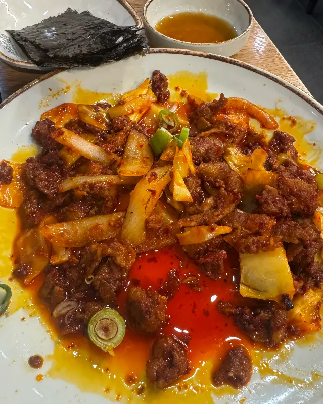 젓가락을 들어 조심스럽게 제육볶음 한 점을 집어 입에 넣었다. 첫 입에 느껴지는 것은 은은한 불맛이었다. 향긋한 불향이 코끝을 간지럽히며 식욕을 돋우었다. 돼지고기는 잡내 없이 부드러웠고, 매콤달콤한 양념이 입안 가득 퍼져 나갔다. 과하지 않은 매콤함 덕분에 맵찔이인 나도 부담 없이 즐길 수 있었다. 양념에 잘 볶아진 양파와 양배추는 달큰한 맛을 더하며 풍성한 식감을 선사했다.