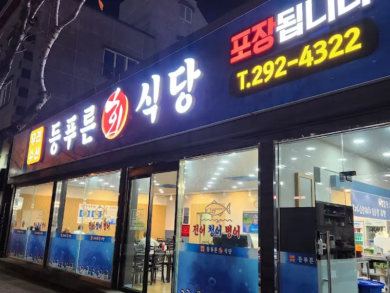 환한 조명이 반기는 우리수산 등푸른회식당 포항문덕점의 외관