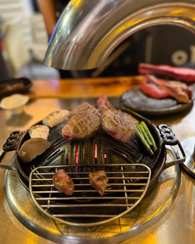 드디어 기다리고 기다리던 양갈비가 등장했다. 선홍빛 육질에 섬세하게 박혀있는 마블링이 신선함을 그대로 드러냈다. 직원분께서 직접 고기를 구워주셨는데, 전문적인 솜씨에 감탄하며 그 모습을 넋 놓고 바라봤다. 숯불 위에 올려진 양갈비는 지글거리는 소리를 내며 맛있게 익어갔고, 그 냄새는 나의 식욕을 더욱 자극했다.